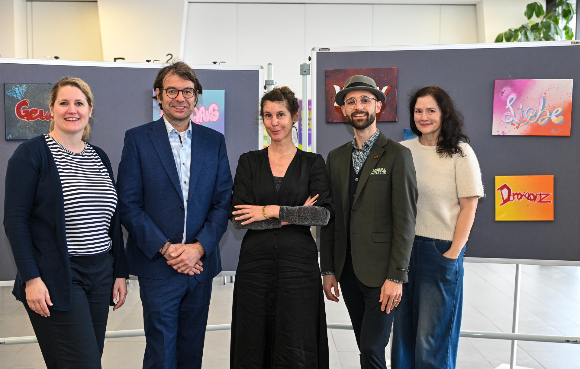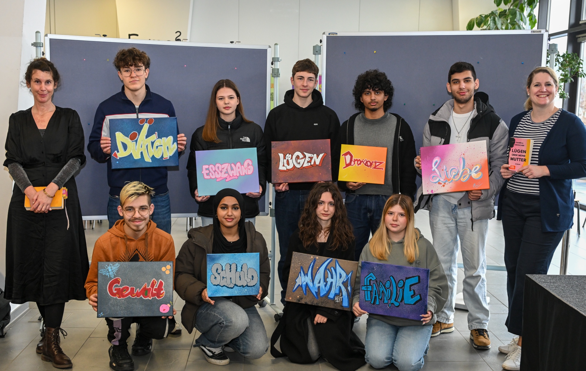 Die Schülerinnen und Schüler der Klasse FOS 10 haben im Vorfeld im Rahmen eines Graffiti-Projekts Schlagwörter zum Roman gestaltet.Eindringliche Passagen und intensive Gespräche: Literatur zum Anfassen