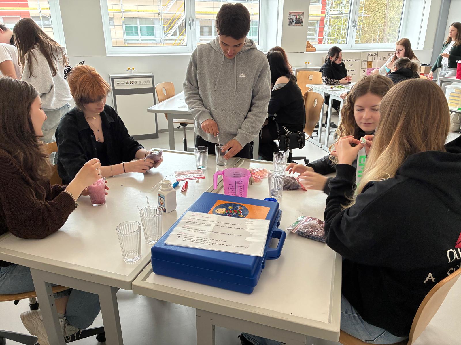 Im Mittelpunkt des Projekttages standen zwei praxisorientierte Workshops, die speziell auf unterschiedliche Ausbildungsrichtungen zugeschnitten waren. Die Klasse BKP 10a der Berufsfachschule für Kinderpflege nahm an einem Stationen-Workshop teil, bei dem einfache Experimente aus verschiedenen MINT-Bereichen durchgeführt wurden. Der Workshop zielte darauf ab, Methoden kennenzulernen, mit denen bereits Kinder spielerisch für Technik und Naturwissenschaften begeistert werden können.