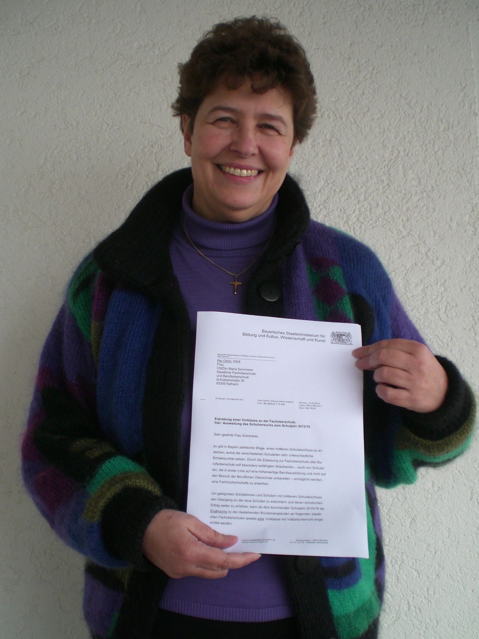 Schulleiterin und OStDin Maria Sommerer freut sich über die schriftliche Nachricht aus dem Kultusministerium.