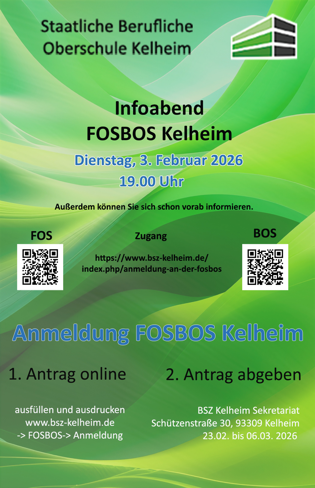 Die Anmeldung für die FOSBOS am BSZ Kelheim ist von Montag, 23. Februar 2026 bis einschließlich Freitag, 6. März 2026, montags bis donnerstags jeweils von 7:30 Uhr bis 15:30 Uhr und freitags von 7:30 Uhr bis 13:00 Uhr im Sekretariat des Staatlichen Beruflichen Schulzentrums Kelheim, Schützenstraße 30, 93309 Kelheim möglich.