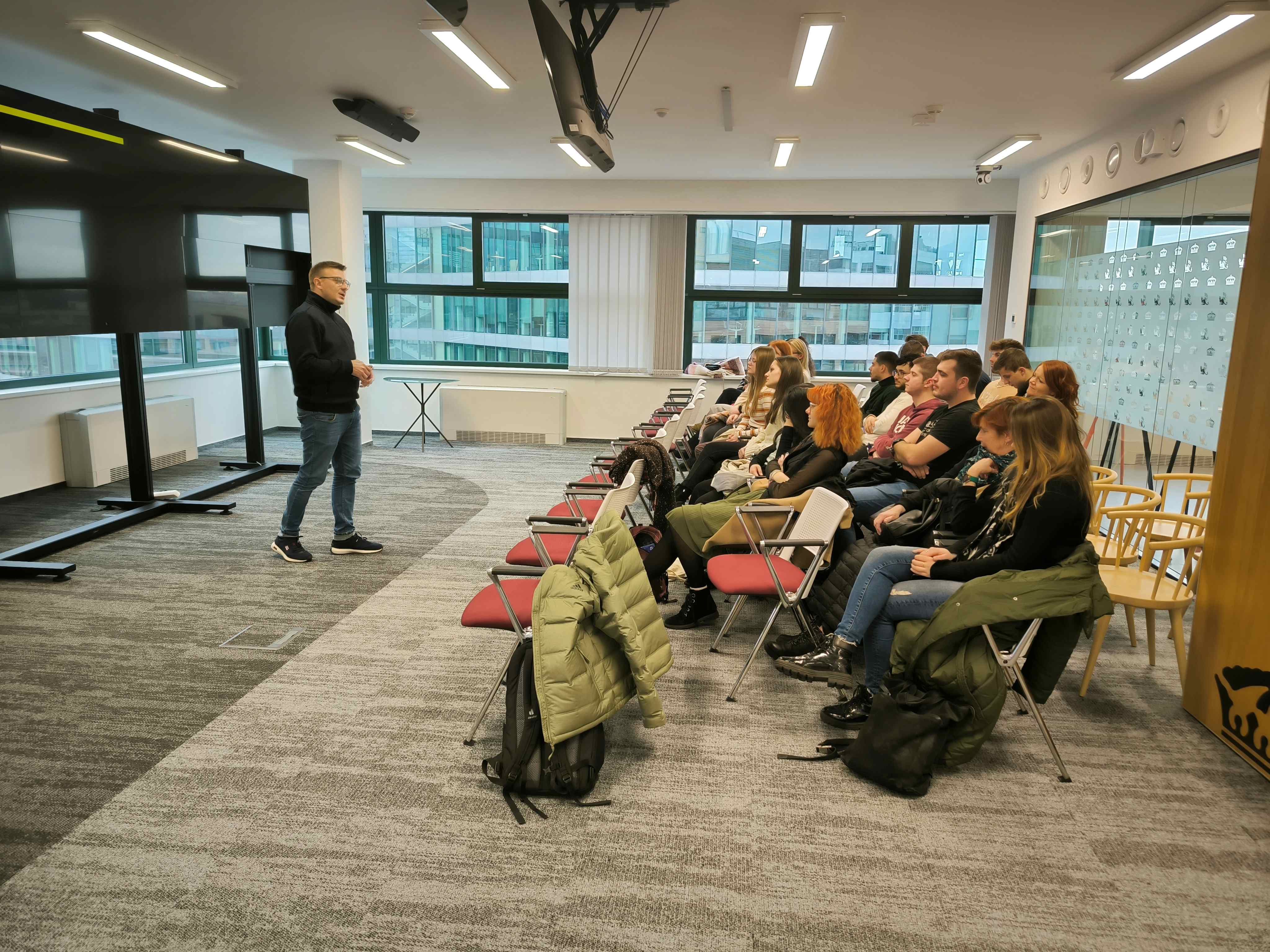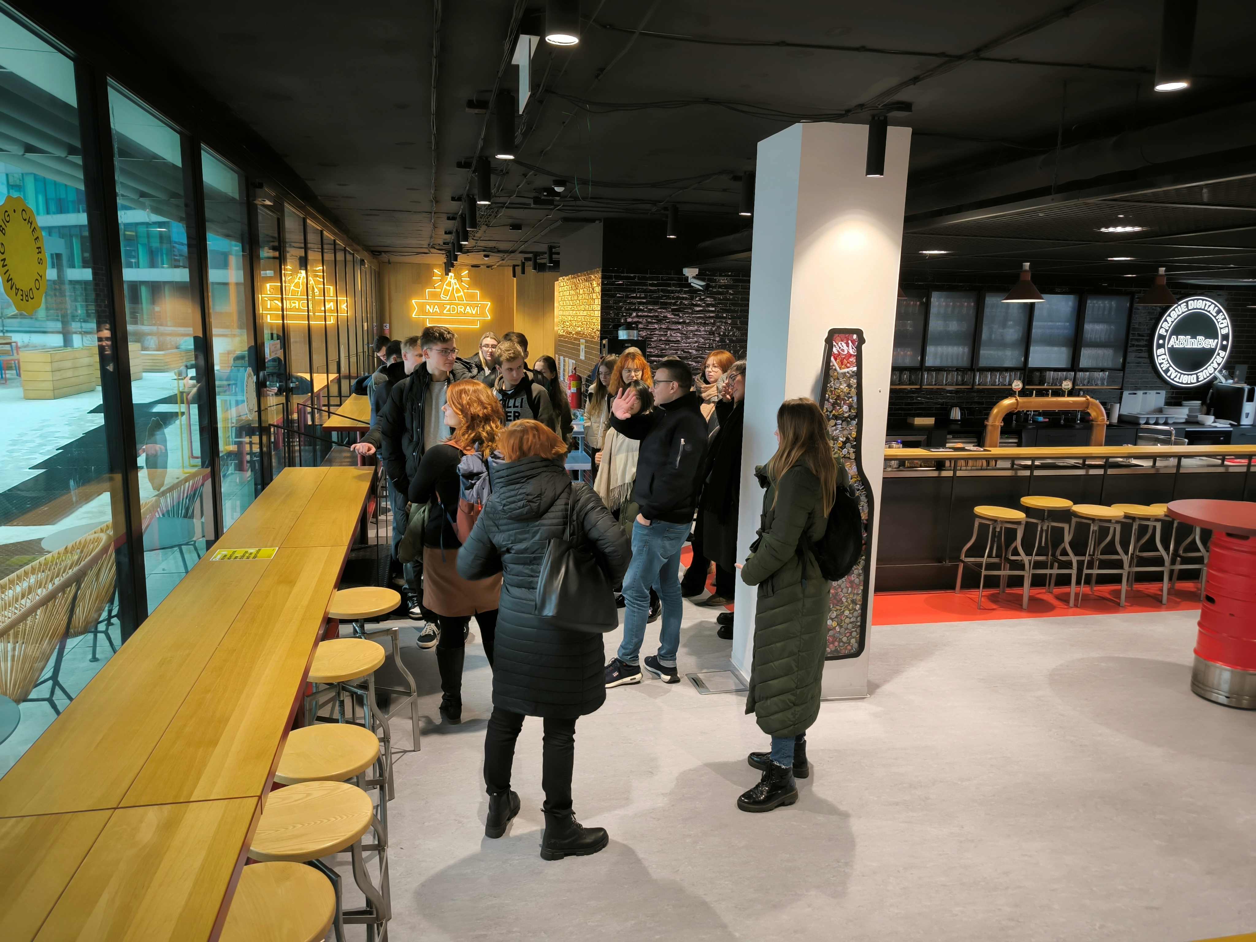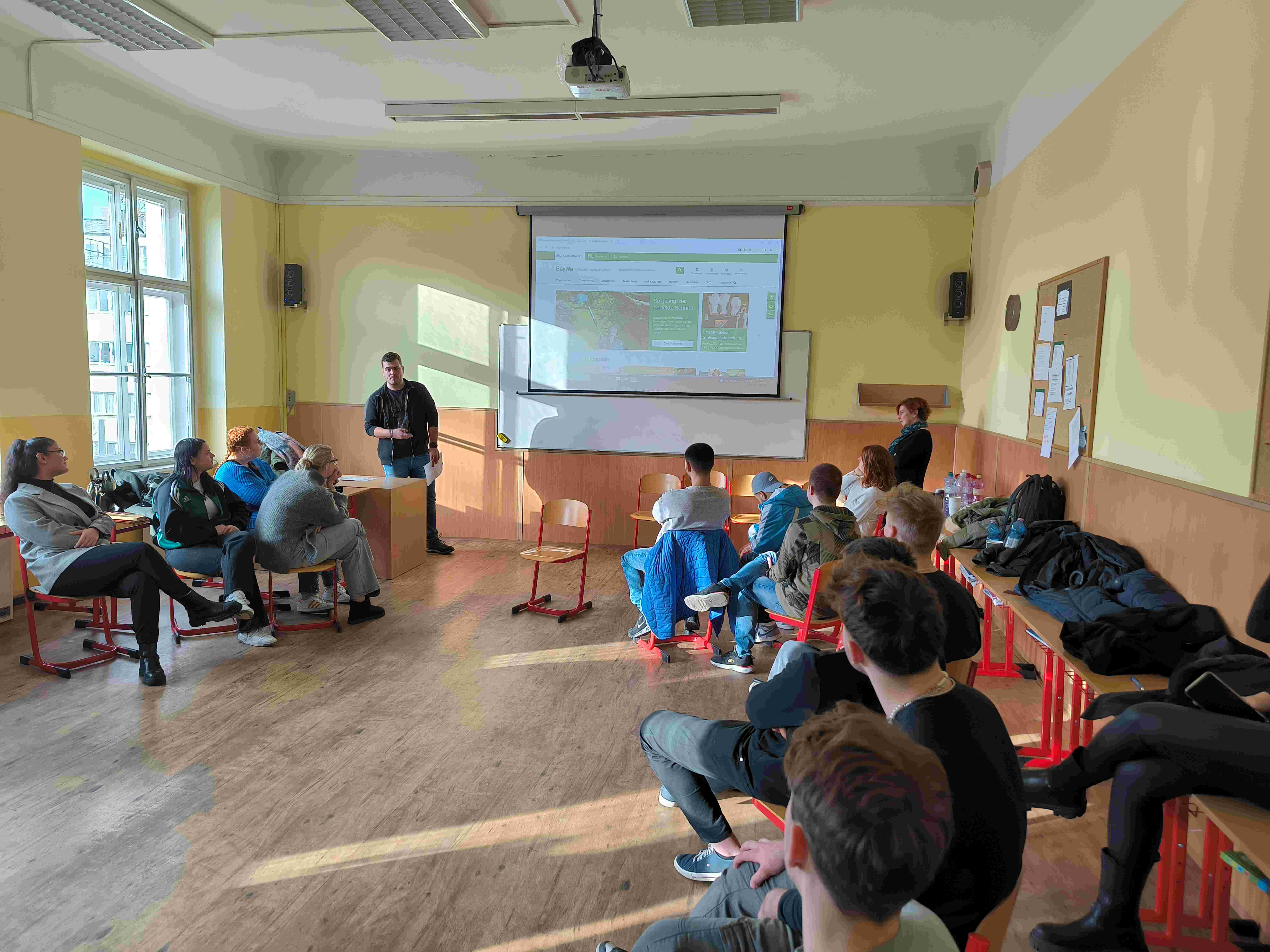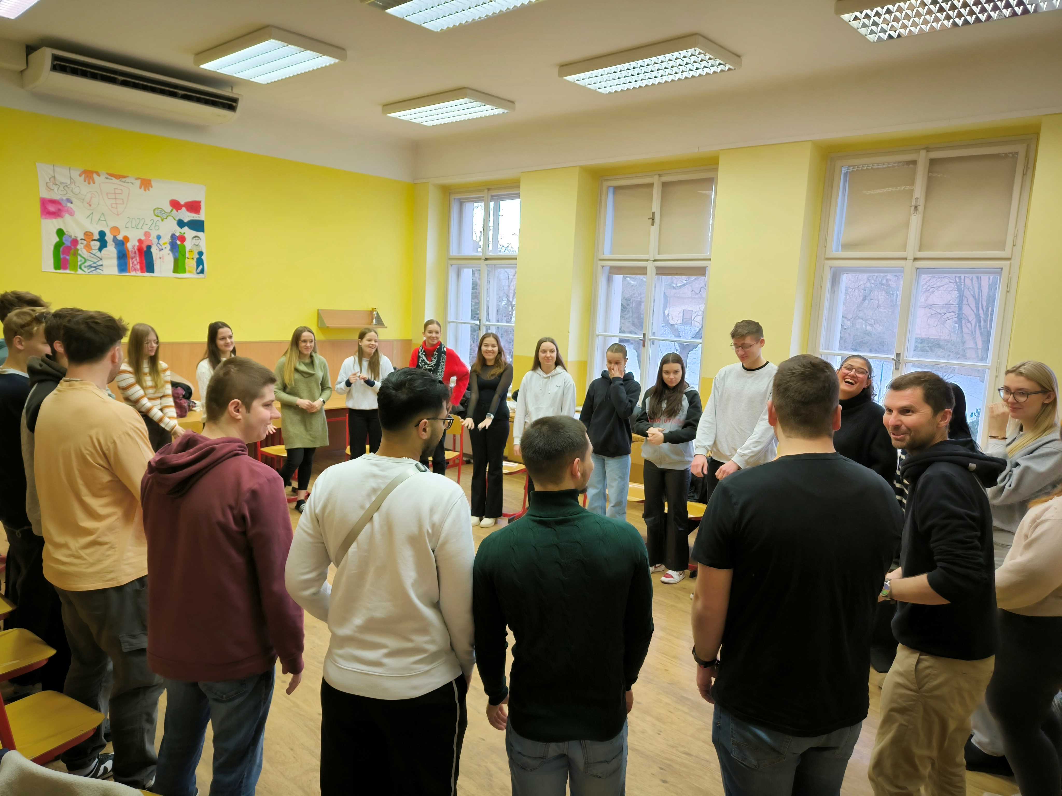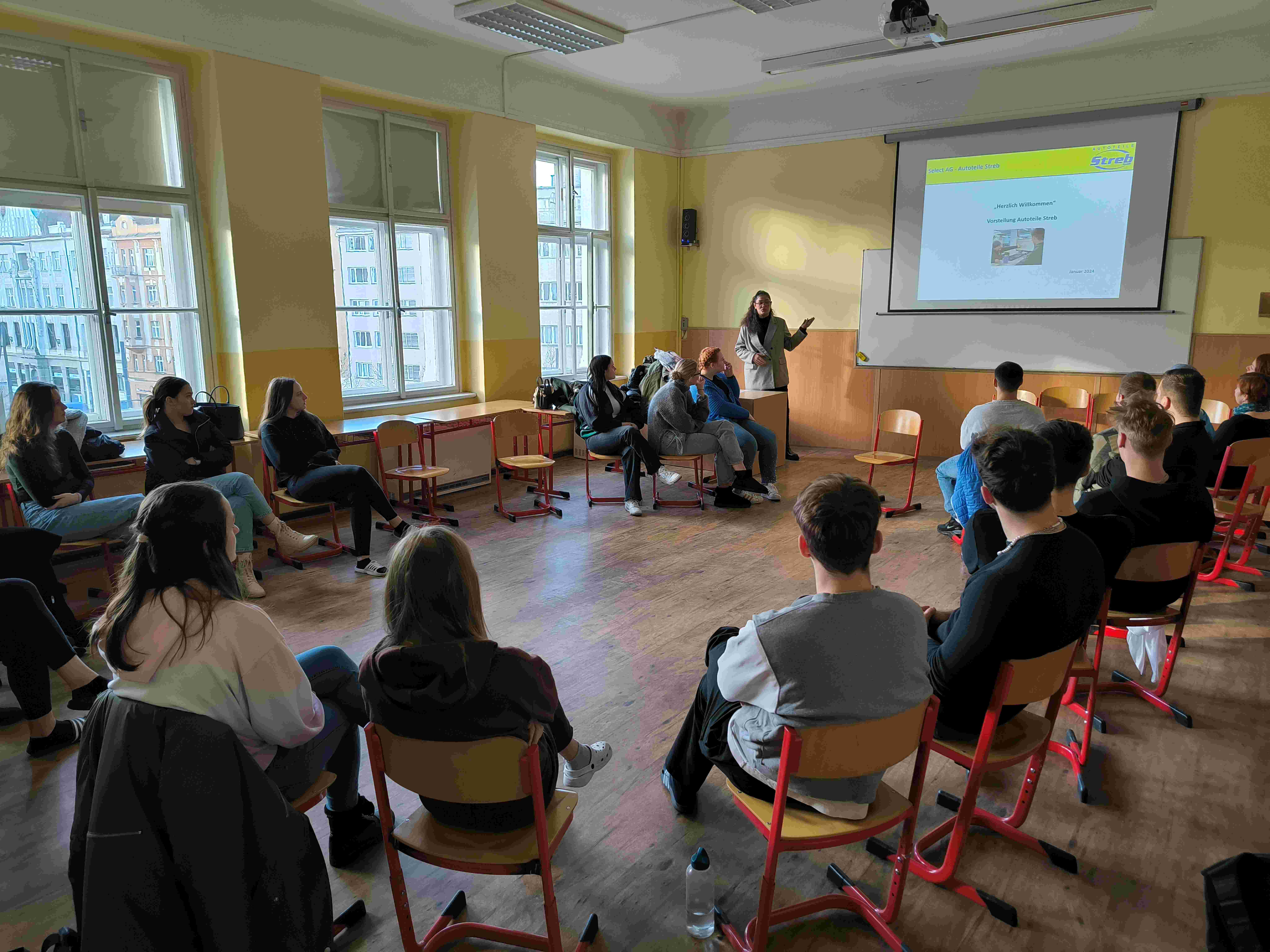 Nach einer vierstündigen Anreise mit der Länderbahn von Regensburg nach Prag nutzte die Besuchergruppe den Rest des Sonntags für die Erkundung der Prager Altstadt. Der folgende Tag führte die angehenden Großhandelskaufleute zur nahegelegenen Partnerschule. Die Handelsakademie Heroldovy sady liegt im Prager Stadtteil Vršovice und ist eine weiterführende Schule, welche im Anschluss an die neunjährige tschechische Grundschulzeit bis zum Abitur führt. Gemeinsam mit einer Schülergruppe der Partnerschule wurde am Vormittag unter Anleitung eines Dozenten eine Sprachanimation durchgeführt, in deren Rahmen den Schülerinnen und Schülern spielerisch Sprache und Kultur des Nachbarlandes vermittelt wurde. Im Anschluss an das gemeinsame Mittagessen besuchte die deutsch-tschechische Schülergruppe nachmittags das Prager Verwaltungszentrum der belgischen Unternehmensgruppe AB InBev, das mit der Koordination und Überwachung globaler logistischer Prozesse des Konzerns betraut ist und aktuell 800 Mitarbeiter aus über 40 Ländern beschäftigt. Einer kurzweiligen Präsentation des Direktors folgte eine spannende Führung durch das Bürogebäude, bei der die Schülerinnen und Schüler moderne Bürokonzepte wie Open-Space-Lösungen und die in Verbindung mit der Zunahme von Homeoffice etablierten Shared-Desk-Konzepte hautnah erleben durften. Am Dienstagvormittag referierten die angehenden Großhändler vor den tschechischen Schülerinnen und Schülern über das duale Ausbildungssystem und stellten ihre Ausbildungsbetriebe vor. Danach hieß es schon Abschied nehmen, und die Reisegruppe machte sich auf den Weg zum Prager Hauptbahnhof, wo am frühen Nachmittag die Rückfahrt angetreten wurde. Neben vielen gewonnenen Eindrücken, gemeinsamen positiven Erfahrungen und neuen Kontakten bleibt auch die Neugier auf mehr.