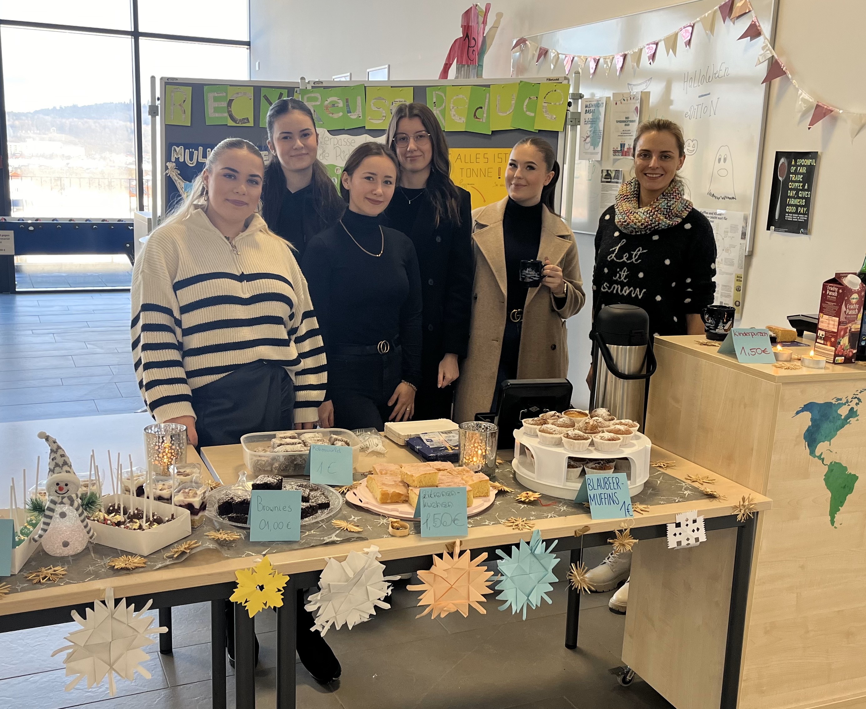 Die Schülerinnen der KBm11b beim Kuchenverkauf und ihre Verbindungslehrerin Fr. Albrecht